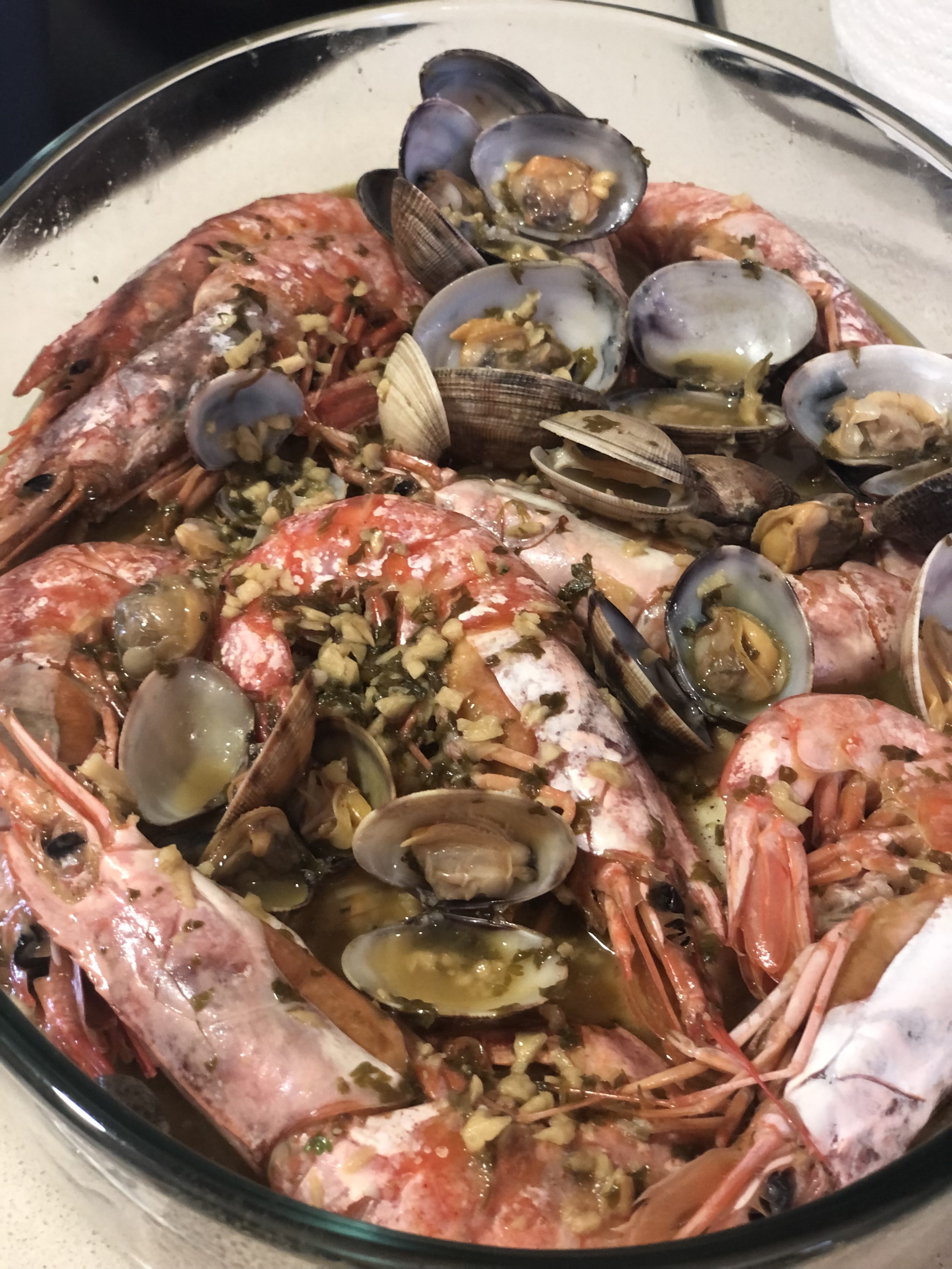 Rodaballo con gambones y almejas al vapor