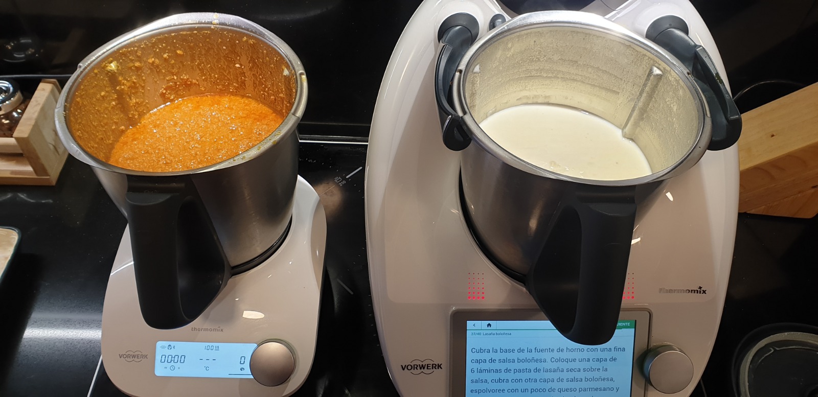 En el Thermomix® Friend hacemos la boloñesa mientras que en el Thermomix® TM6 hacemos la bechamel, así podemos ahorrar tiempo.