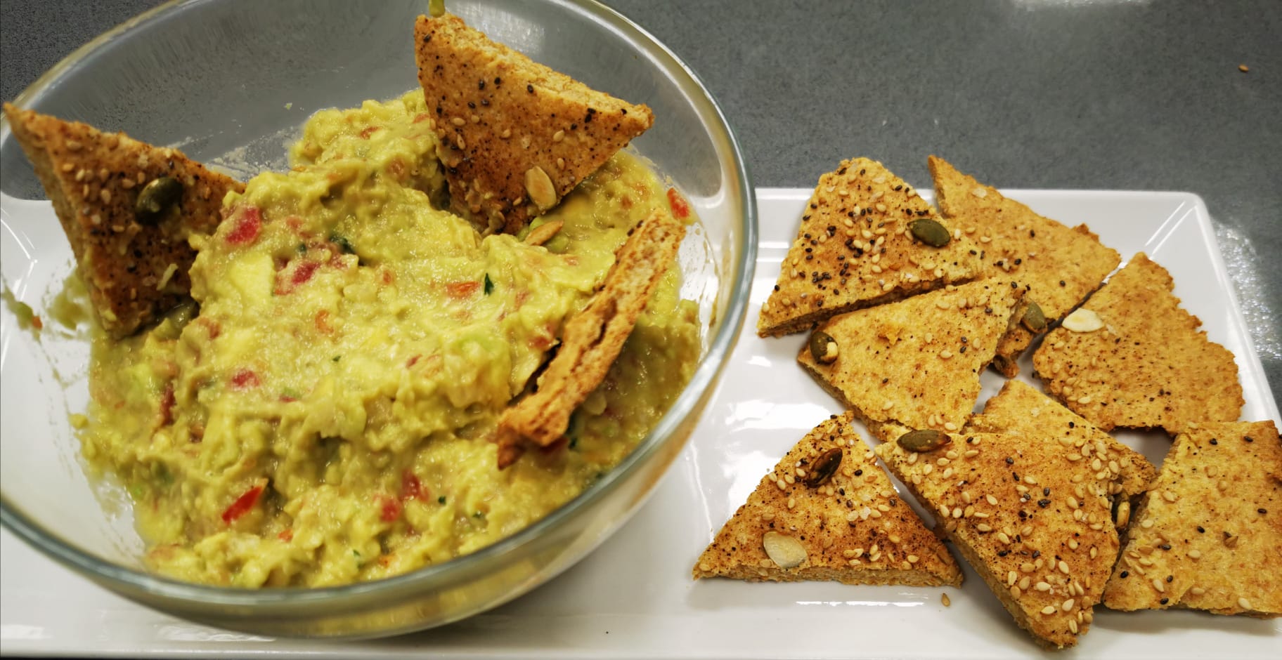 Unos crackers sin harinas y un poco de guacamole para acompañarlos.
