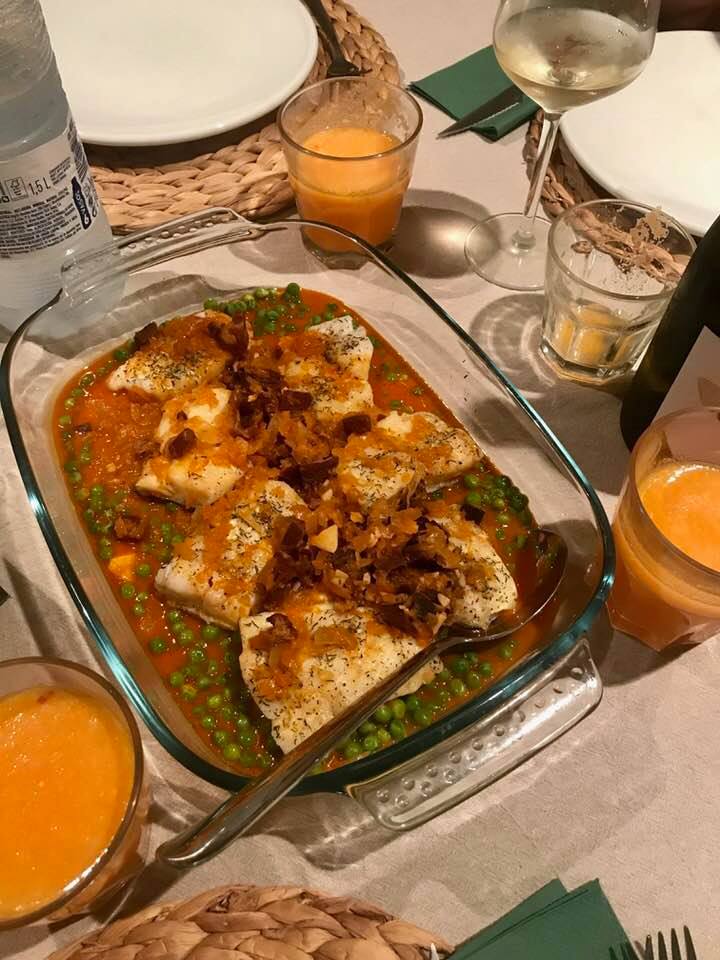 LOMOS DE PESCADO Y GUISANTES CON JAMÓN AL PIMENTÓN