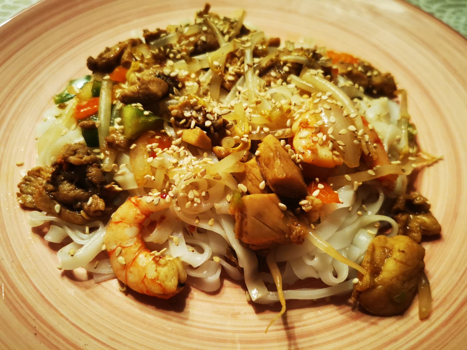 Noodles de pollo y langostinos