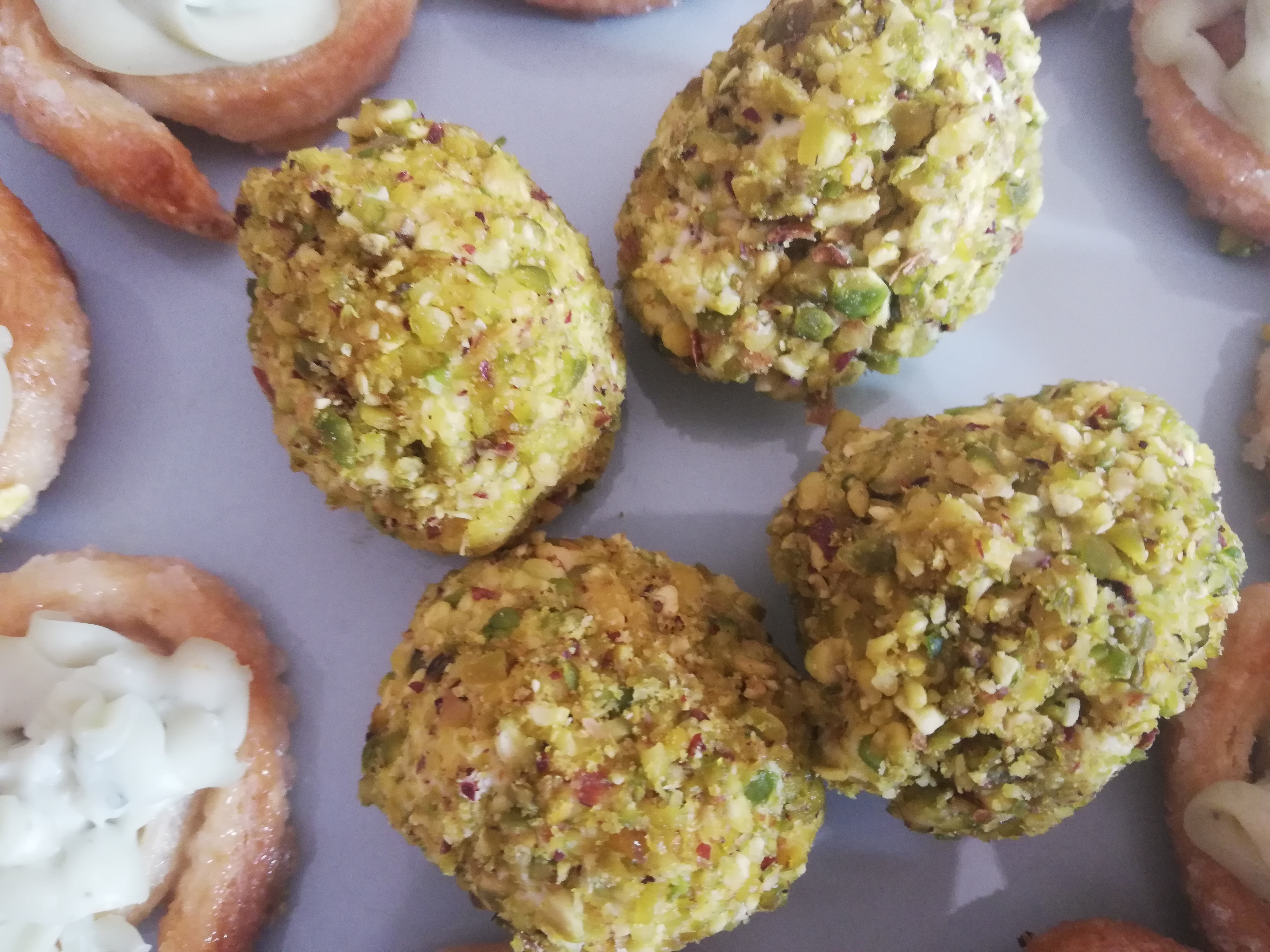 Con una cucharilla, tome una porción de la crema de queso, introduzca una uva dentro y con otra cucharilla y más crema, cubra la superficie de la uva en su totalidad. Reboce con pistacho y termine de darle forma de bola. Coloque las bolas en una bandeja y conserve en el frigorífico.