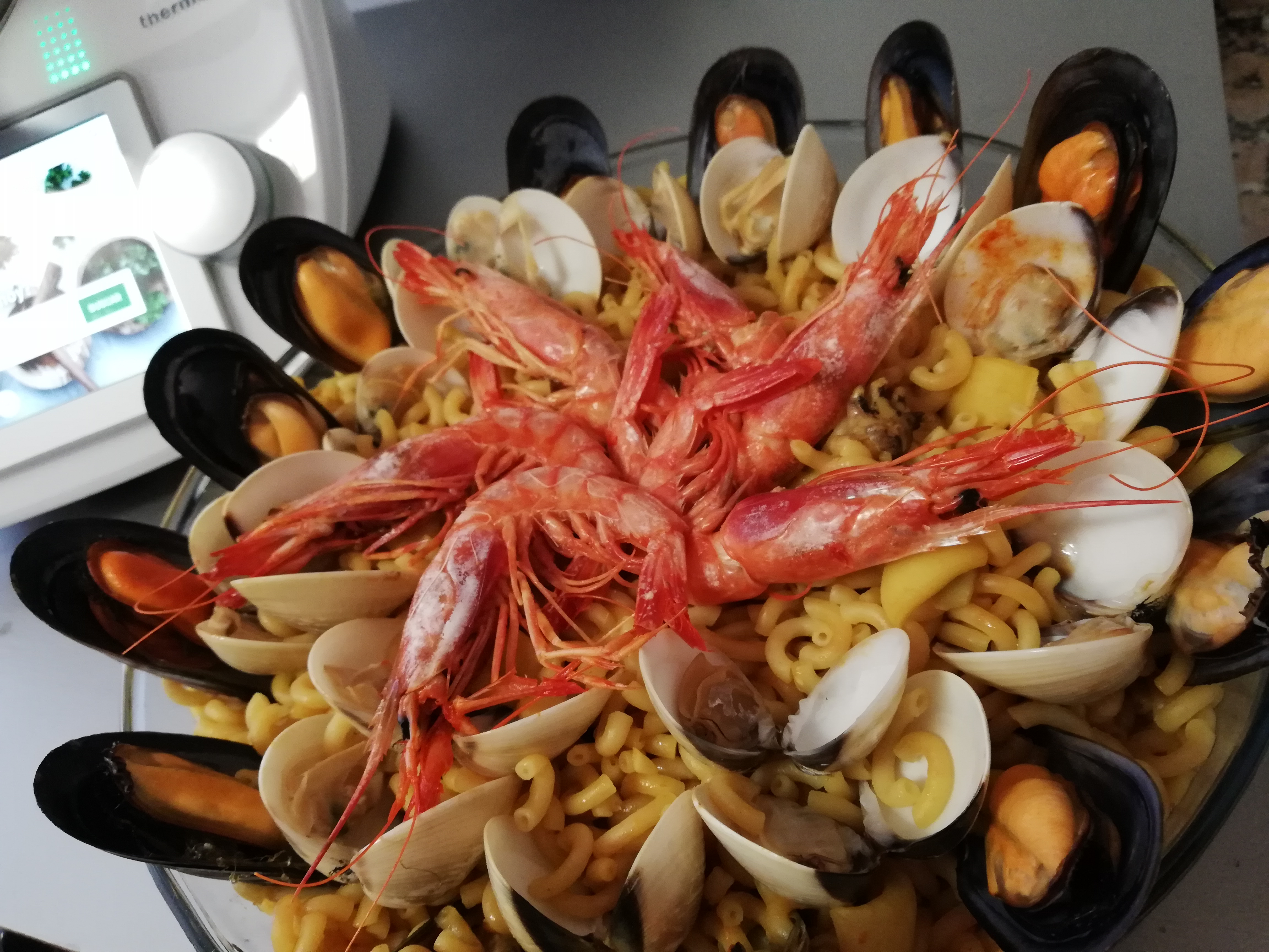Añada al vaso los fideos y programe 7 min/100°C/giro inverso/vel cuchara. Vierta el contenido del vaso en una fuente y coloque encima los mejillones, las almejas y los gambones. Deje reposar unos minutos y lista para comer.