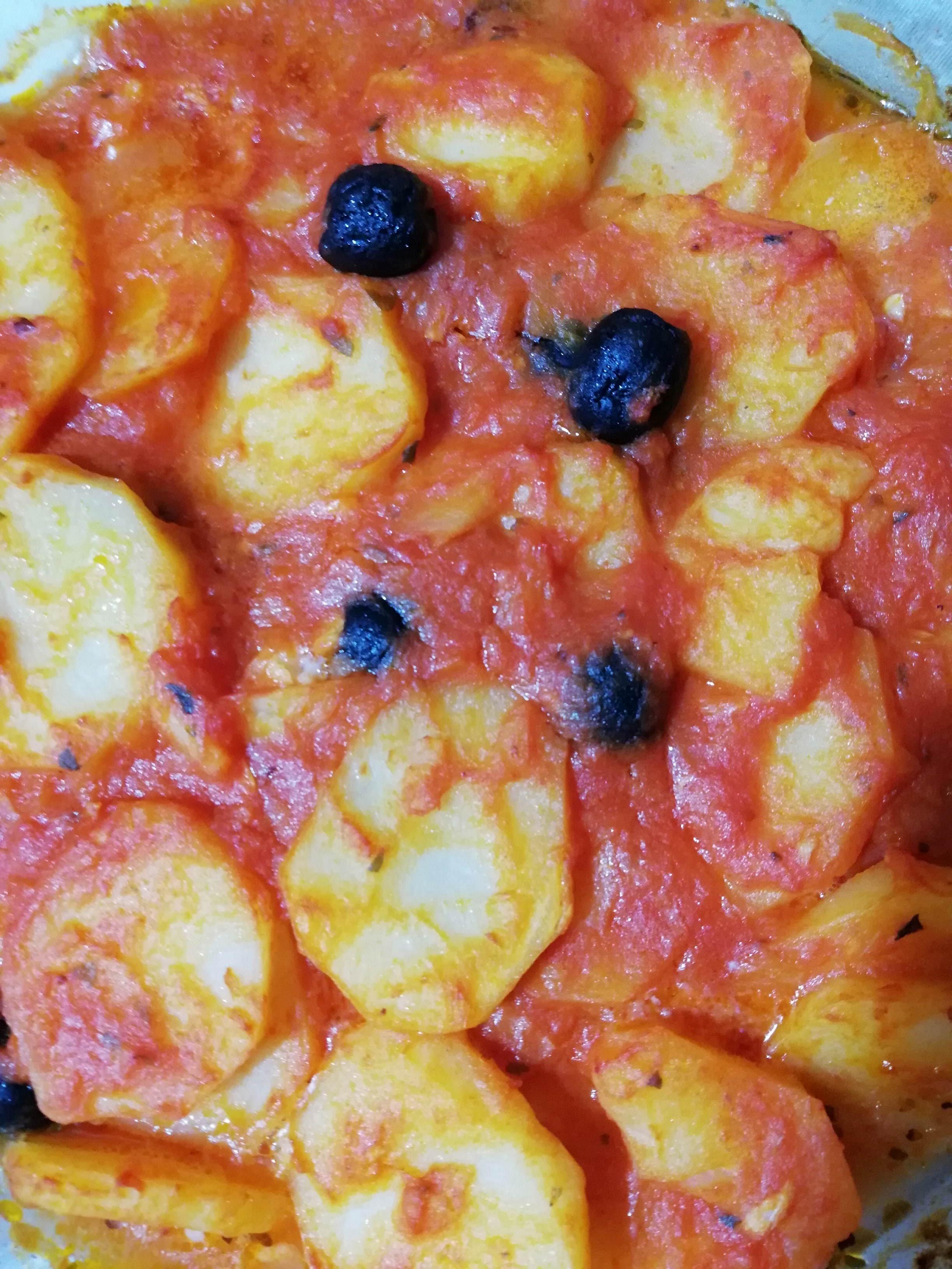 - Añade el tomate, el agua, la sal, las aceitunas, el orégano y la pimienta y programa 10 min/100°C/giro inverso/vel cuchara. Mientras tanto, precalienta el horno a 200°C. Engrasa y espolvorea con pan rallado una fuente refractaria (20x30 cm), reparte los trozos de bacalao y reserva. Vierte el contenido del vaso en la fuente reservada sobre el bacalao.