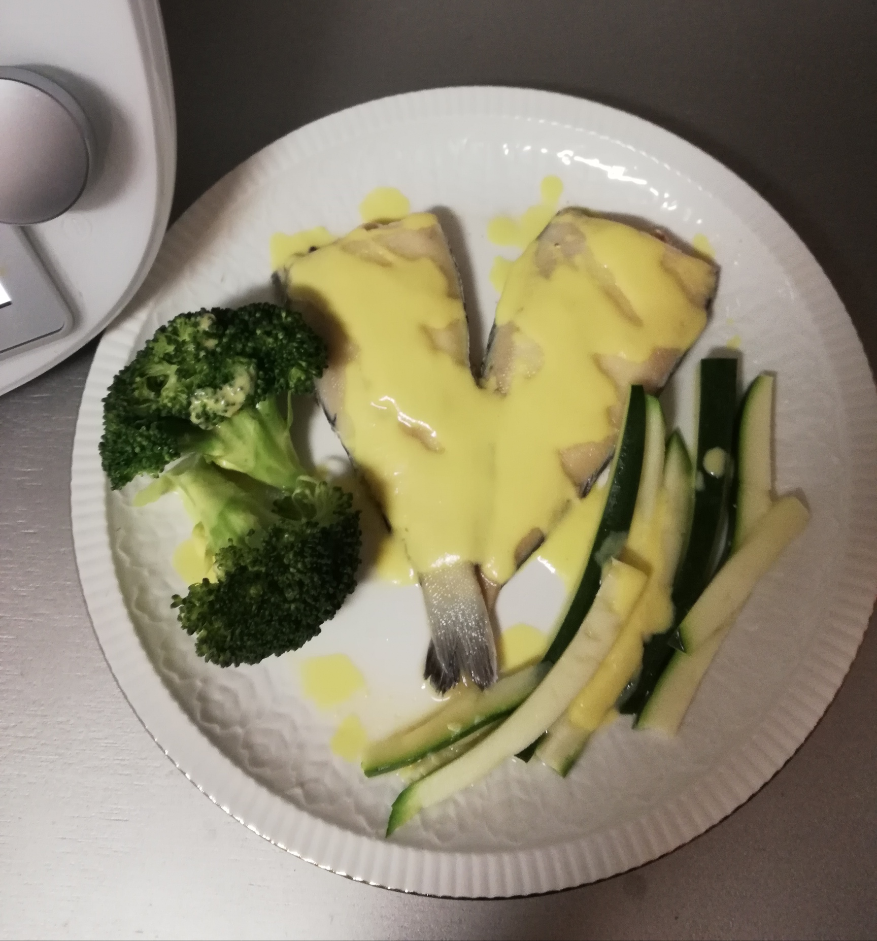 Añada al vaso el yogur y la pimienta. Caliente 3 min/90°C/vel 1 y triture 2 min/vel 10. Sirva los filetes de lenguado con el calabacín y el brócoli y la salsa de puerro y azafrán.