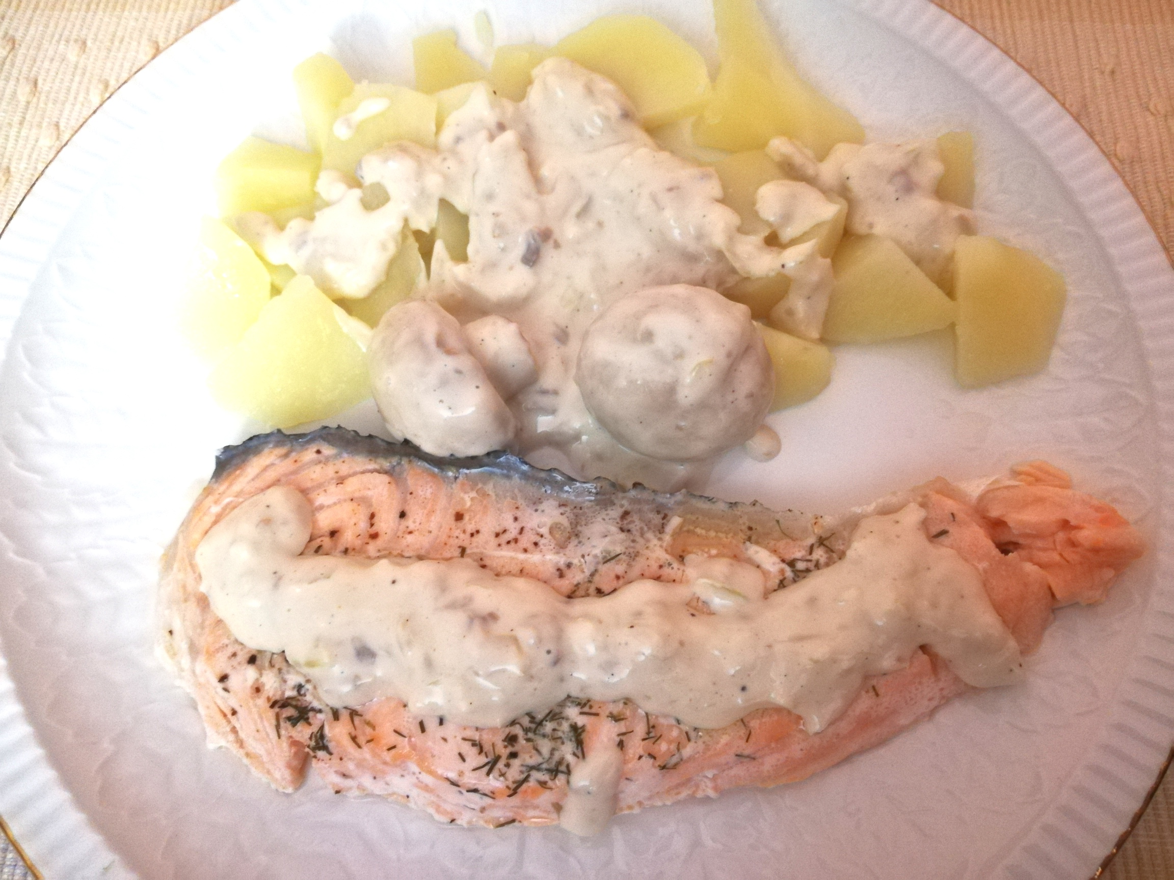 - Añade 75 g de champiñones, la piel de limón rallada, la nuez moscada, ½ cucharadita de sal y 1 pellizco de pimienta y programa 5 min/90°C/giro inverso /vel 1. Sirve el salmón con la salsa y las patatas.