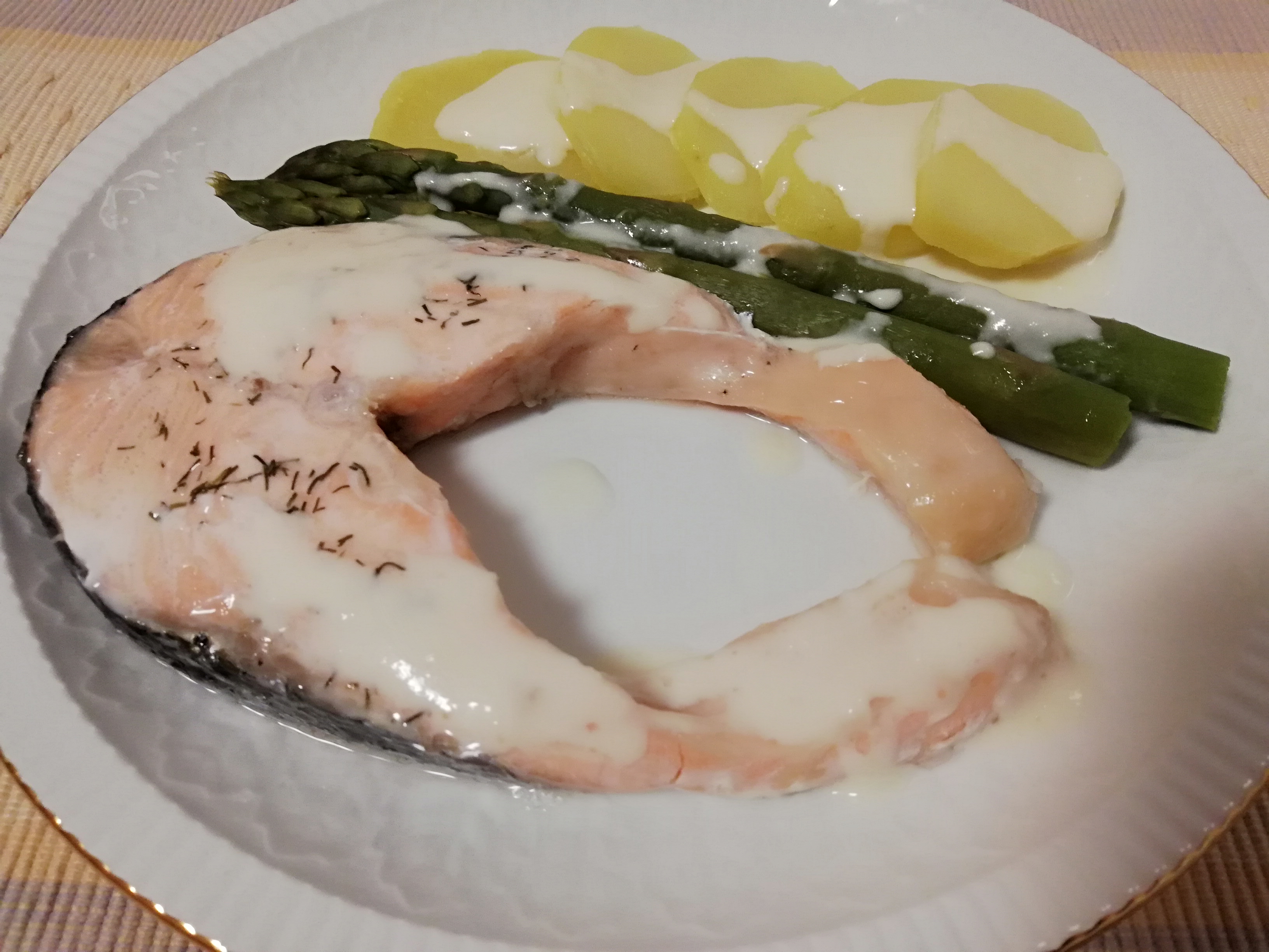 - Añade al vaso el queso rallado y la nata y programe 3 min/100°C/vel 6. Mientras tanto, coloca las patatas y los espárragos en una fuente y pon encima el salmón.
