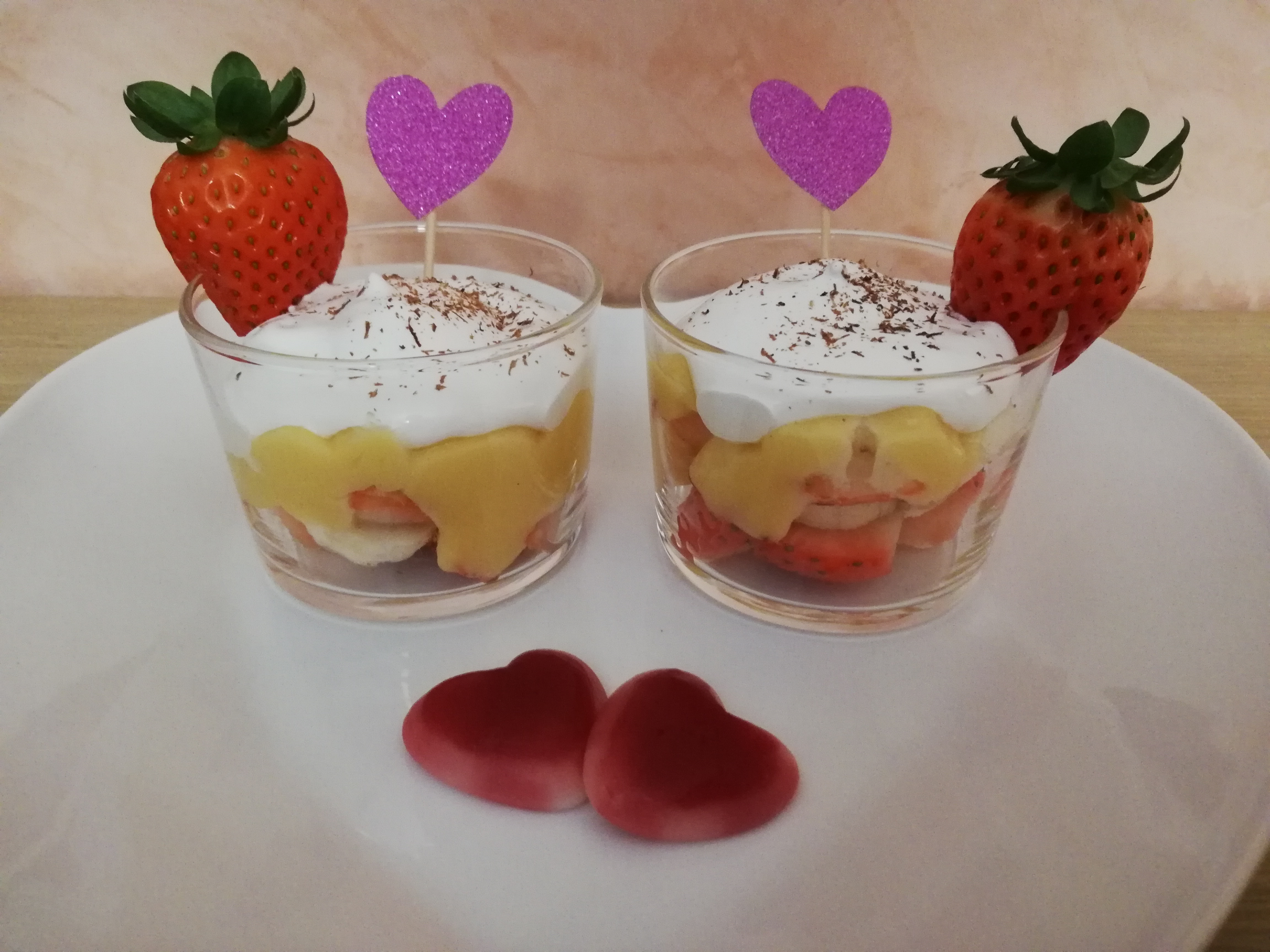 - Casca 2 huevos y reserva por separado las claras y las yemas (las claras no deben tener nada de yema). Con un pelador, retira 2-3 tiras de la piel del limón (solo la parte amarilla) y pélalo retirando toda la parte blanca y las semillas. Añade las fresas y el plátano en 4 vasos pequeños.