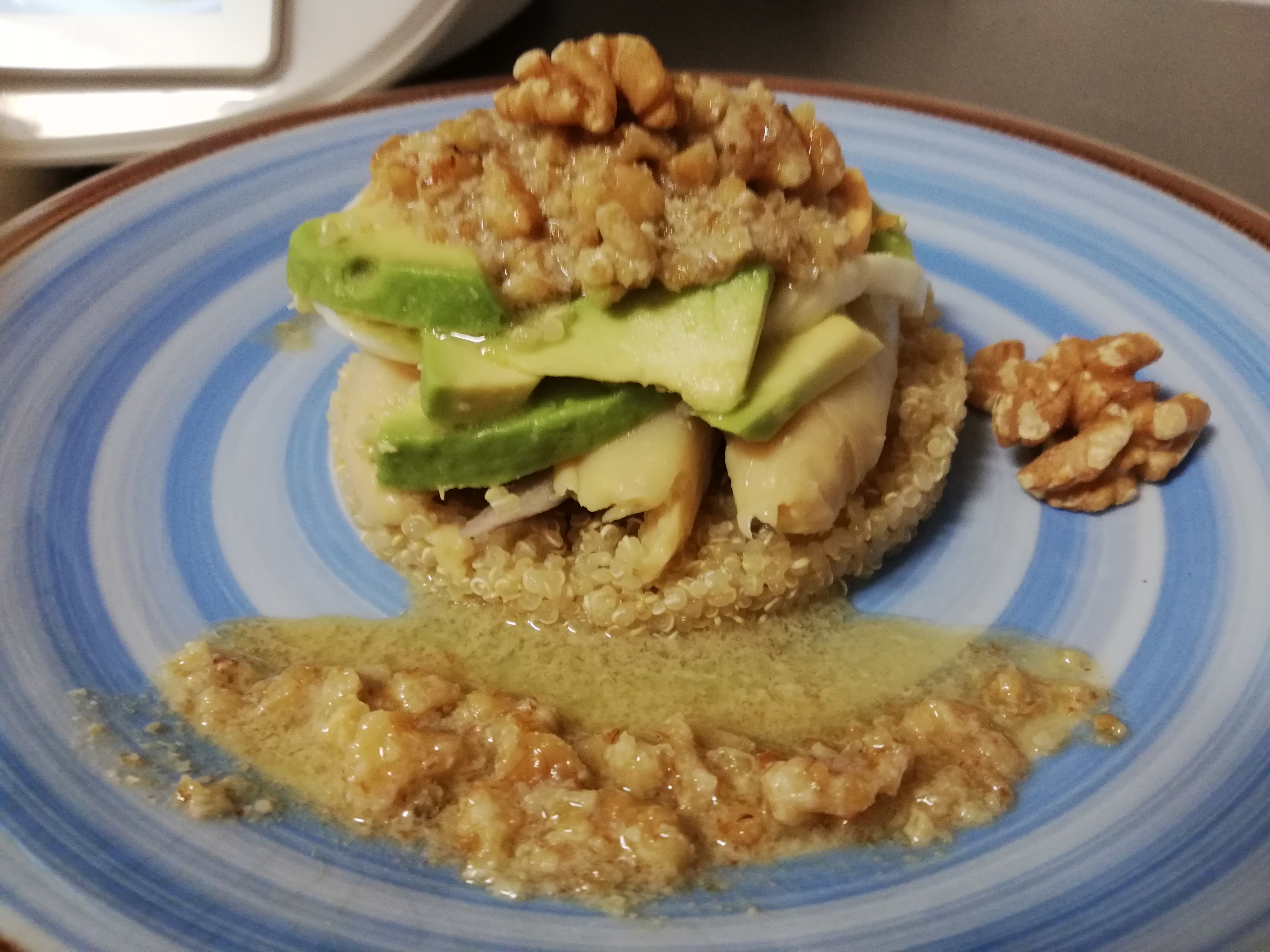 Ponga en el vaso las nueces, 100 g de aceite, el vinagre y 1 cucharadita de sal y trocee 4 seg/vel 4. Vierta la vinagreta en el bol sobre la quinoa, mezcle y sirva.