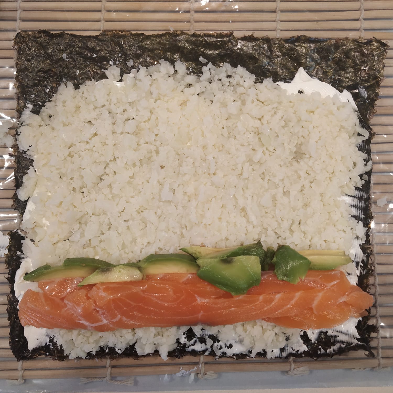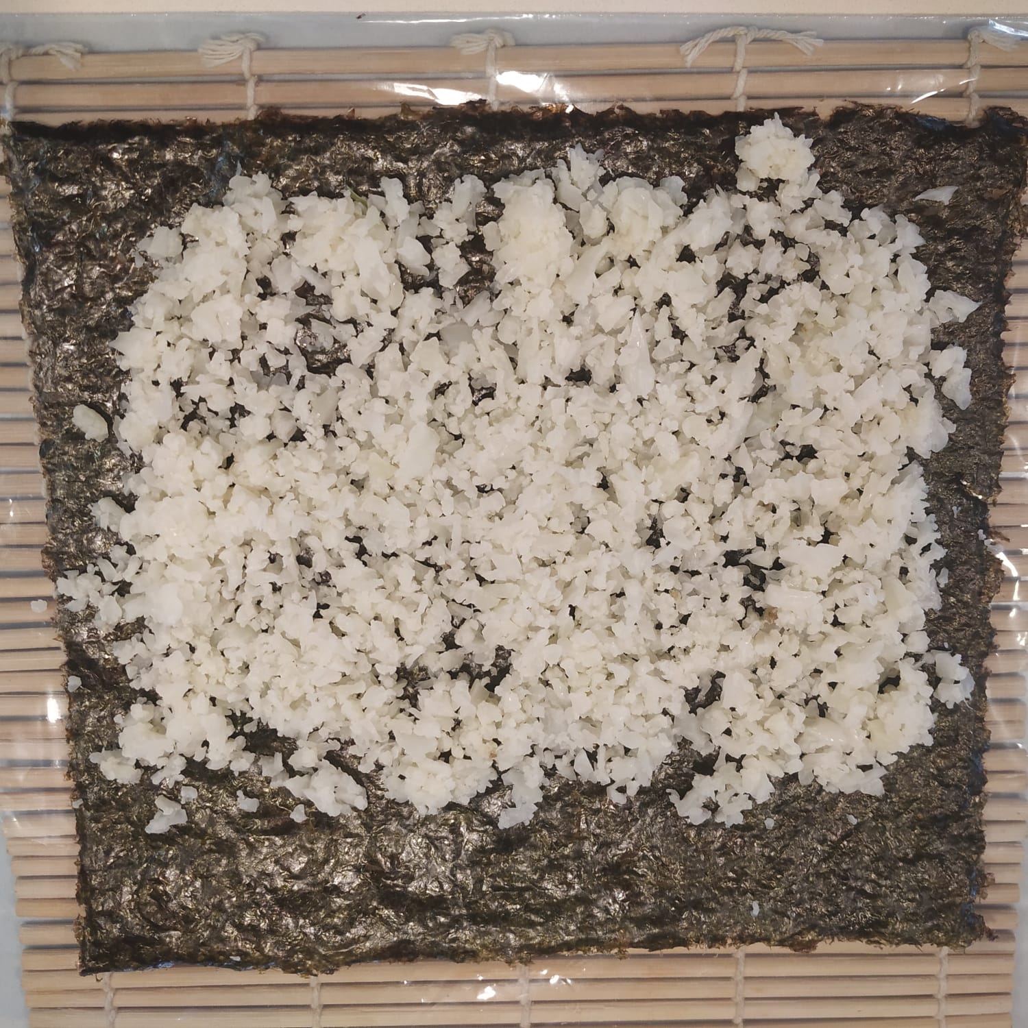 En esos intentos fallidos vi que si se cuece demasiado la coliflor, a la hora de estrujarlo, se hará una pasta que para mí, no es agradable al paladar. Si nos saltamos el paso de escurrirla, quedará demasiado húmedo y empapará el alga, con lo cual, para mí, un desastre total. La idea de enfriarlo bajo el grifo, le quita el sabor a coliflor, ¡no se apreciará para nada!