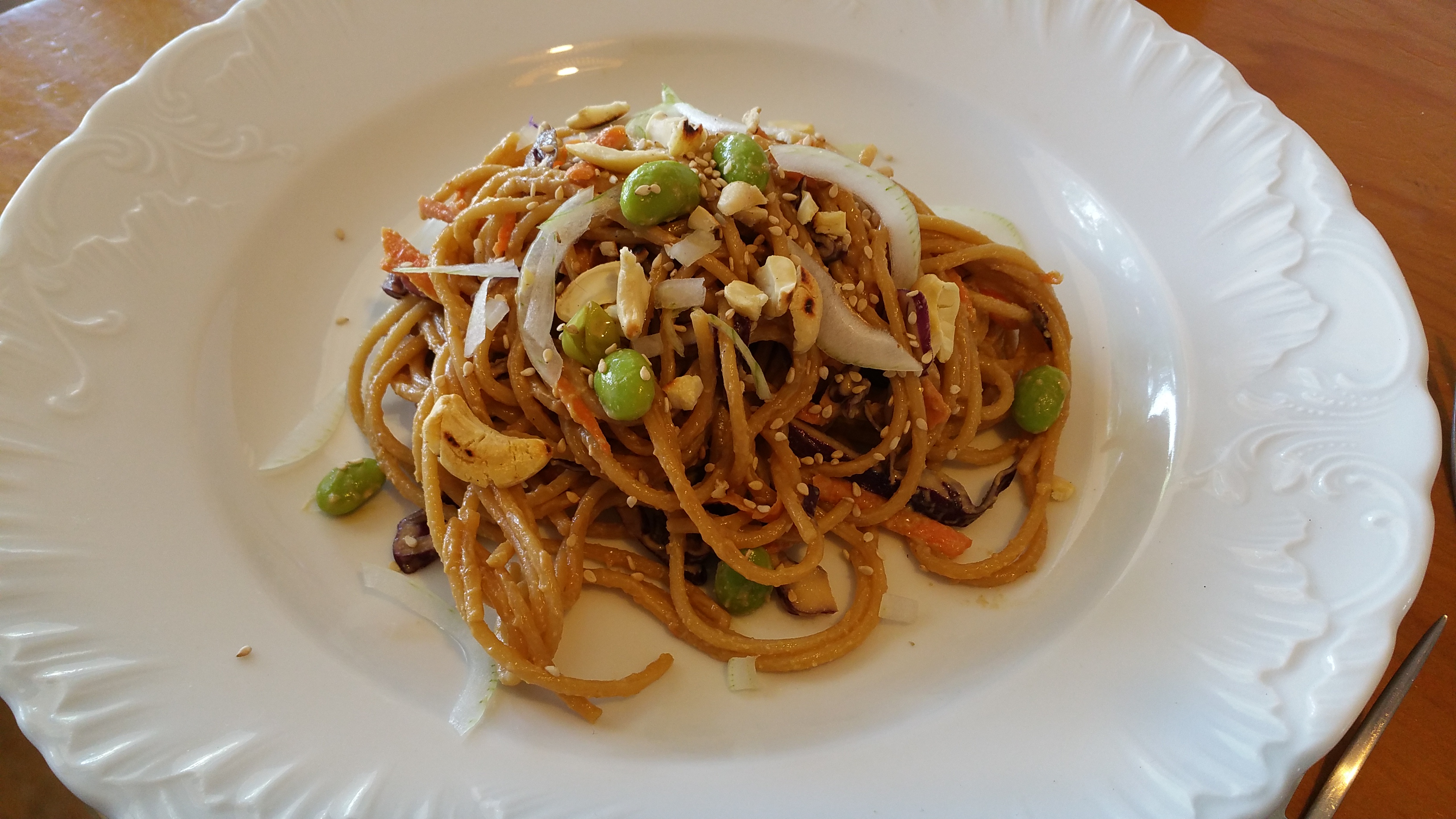 Otro plato de pasta integral que en este caso, se puede comer a temperatura ambiente, ya que tanto la salsa como las verduras (menos las edamame), van en crudo. La salsa de cacahuetes se podría usar perfectamente para ensaladas, rollitos tipo vietnamitas, empanadillas asiáticas, etc.