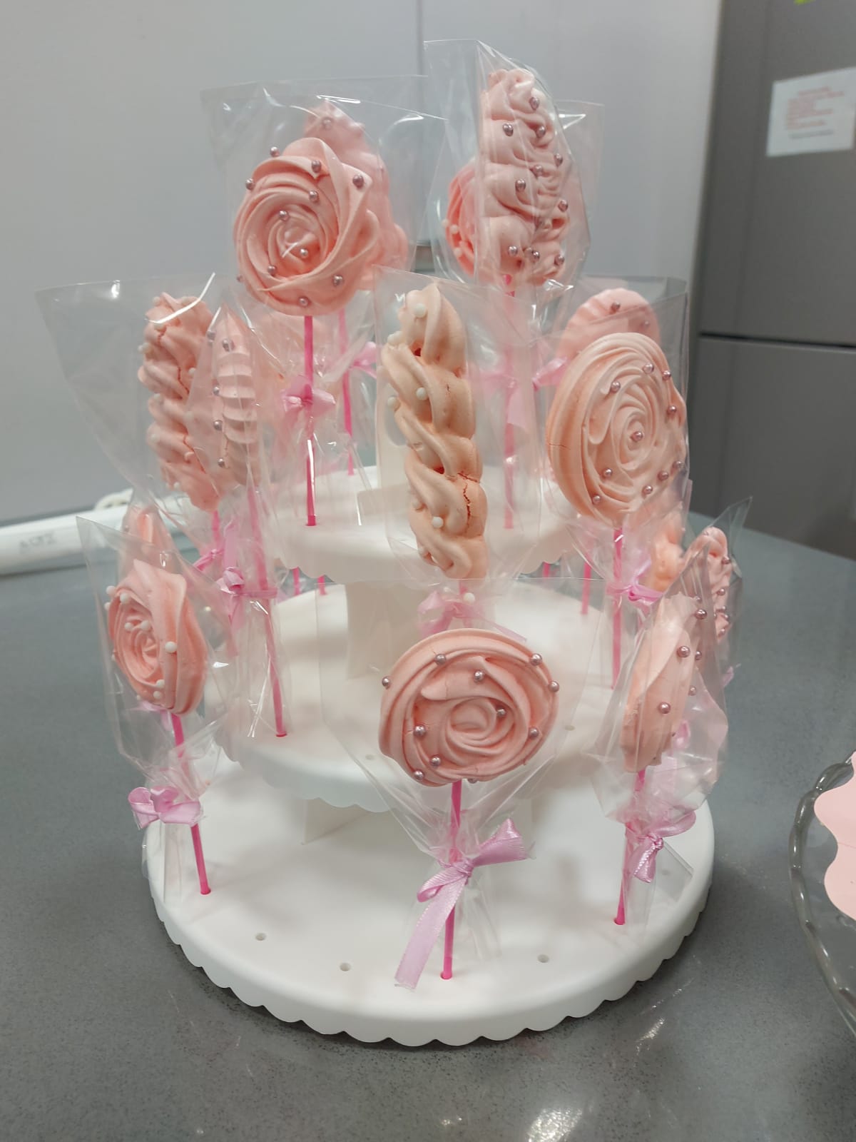 Coloque las brochetas en la bandeja preparada y cúbralas hasta la mitad con el merengue haciendo diferentes formas. Espolvoree con grajeas de azúcar, azúcar perla, etc.