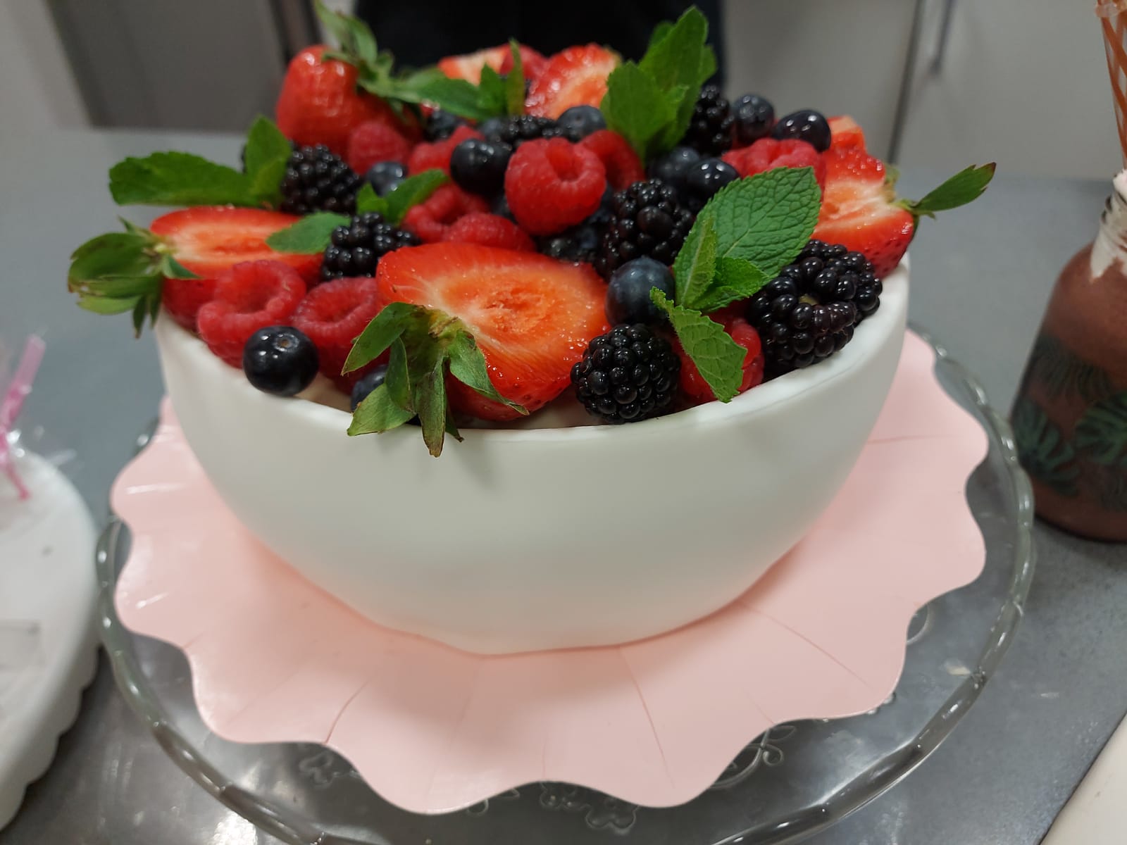 Con ayuda del rodillo, estire el fondant en 2 tiras de aprox. 9x33 cm. Colóquelas alrededor del bizcocho formando el bol. Ajuste bien las tiras de fondant, recorte el exceso en las uniones, presione suavemente el fondant de las uniones para sellarlas y alíselas. Pegue bien el fondant presionando ligeramente, remétalo por la parte de abajo del bizcocho y abra el borde superior hacia afuera para formar el bol. Coloque los frutos rojos dentro en la superficie de crema de mantequilla.